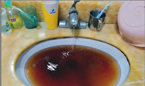 隨后,記者來到鮑先生家中,在衛(wèi)生間的洗臉池中,有一盆黑褐色像醬油一樣的水。“這還是中午接的水,放在這里沉淀了這么長時間,顏色都沒變。”鮑先生說,由于前天上夜班,他休息到昨天中午才起床。鮑先生本準備洗漱做飯,一開水龍頭卻嚇了一跳,流出來的水又黃又渾濁,他只能用家里剩下的一點涼開水刷牙。“從發(fā)現(xiàn)自來水變色到現(xiàn)在幾個小時了,水還是臟的,也不知道是啥原因。”鮑先生當著記者的面打開水龍頭,自來水水流很小,而且依然是黑褐色的。